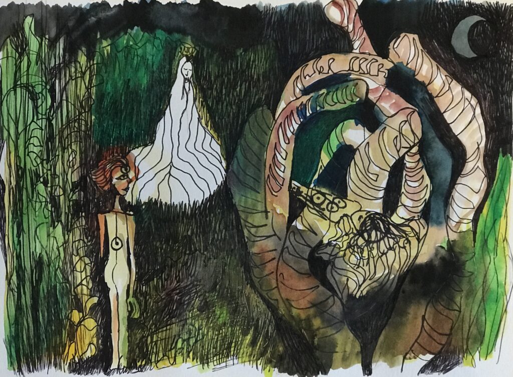 Sueño. Despierto en el sueño. Estoy ahí, presente, me observo. Estoy en la selva. Me han entregado medicina en un vaso de madera. Todo es oscuro. No se ve nada. Escucho ícaros. Mi cuerpo se desdobla. Una mujer se observa a sí misma morir. Esa mujer soy yo, tú, él, ella, nosotros. Veo cómo me traga la tierra, los gusanos son enormes y me devoran. Mi cuerpo se desintegra. Observo cómo muero, y al hacerlo siento muchísima paz. Muchísima paz. Me inunda una sensación de eternidad. Veo cómo muere mi cuerpo y siento mi alma intacta, viva. Ella está ahí conmigo. Ella nunca morirá. En el proceso me acompaña la energía de una madre divina, quizás la Virgen María. Siento mucha luz.